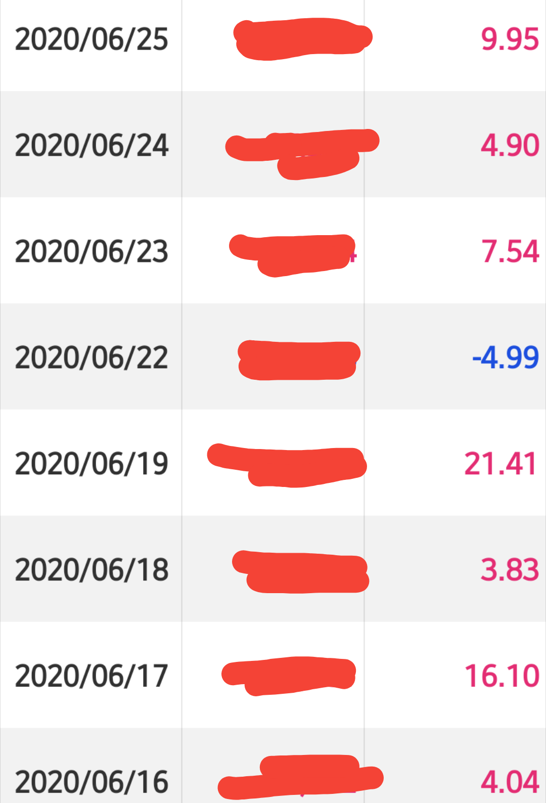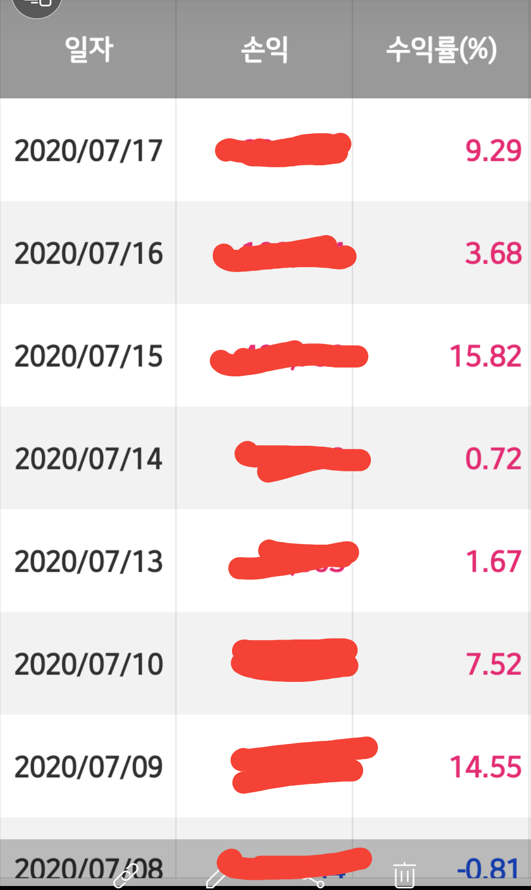 👌이번 실전투자대회 한달 수익률 오늘까지의 매일매일의 기록이다. 다 더해보면 최종 수익률이 나온다.